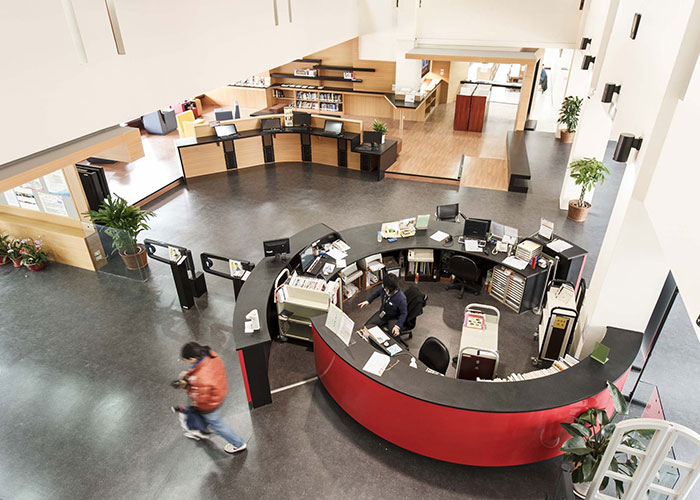 学生总是可以找到一个舒适的地方,他们是否愿意单独学习或在一组。与多媒体设备,以及可移动的扶手椅书桌提供多样的学习功能。几个自修室亲密的角落放置在开放的区域。噪音现在允许在图书馆,鼓励学生一起工作。预计可容纳一个不断变化的校园文化和各种服务和活动方案。